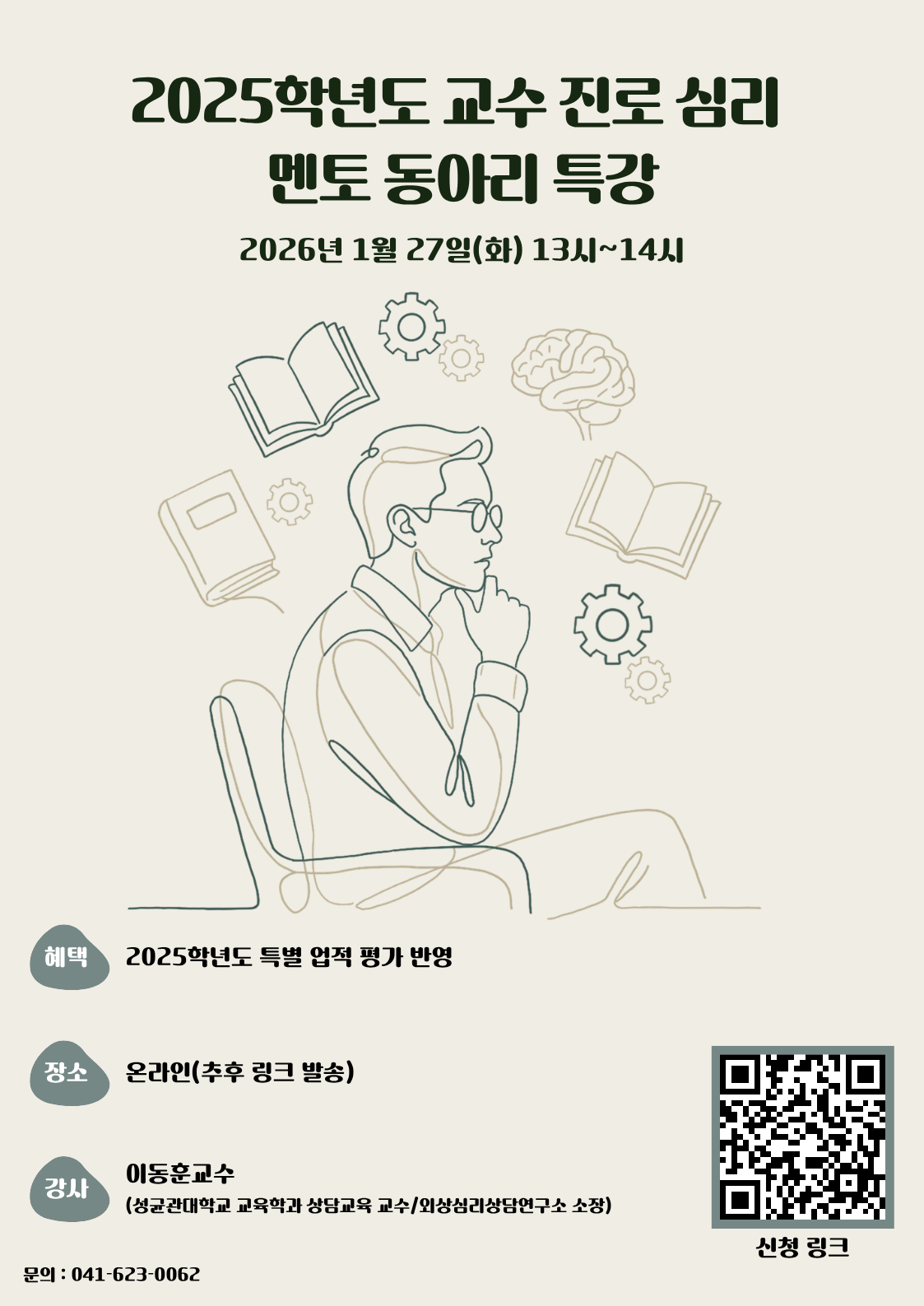 학생상담센터에서는 2025학년도 교수 진로 심리 멘토 동아리 특강을 진행합니다.