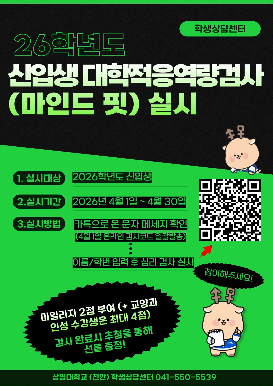 천안 [학생생활] [학생상담센터] 2026학년도 신입생 적응역량검사(마인드핏) 안내 -