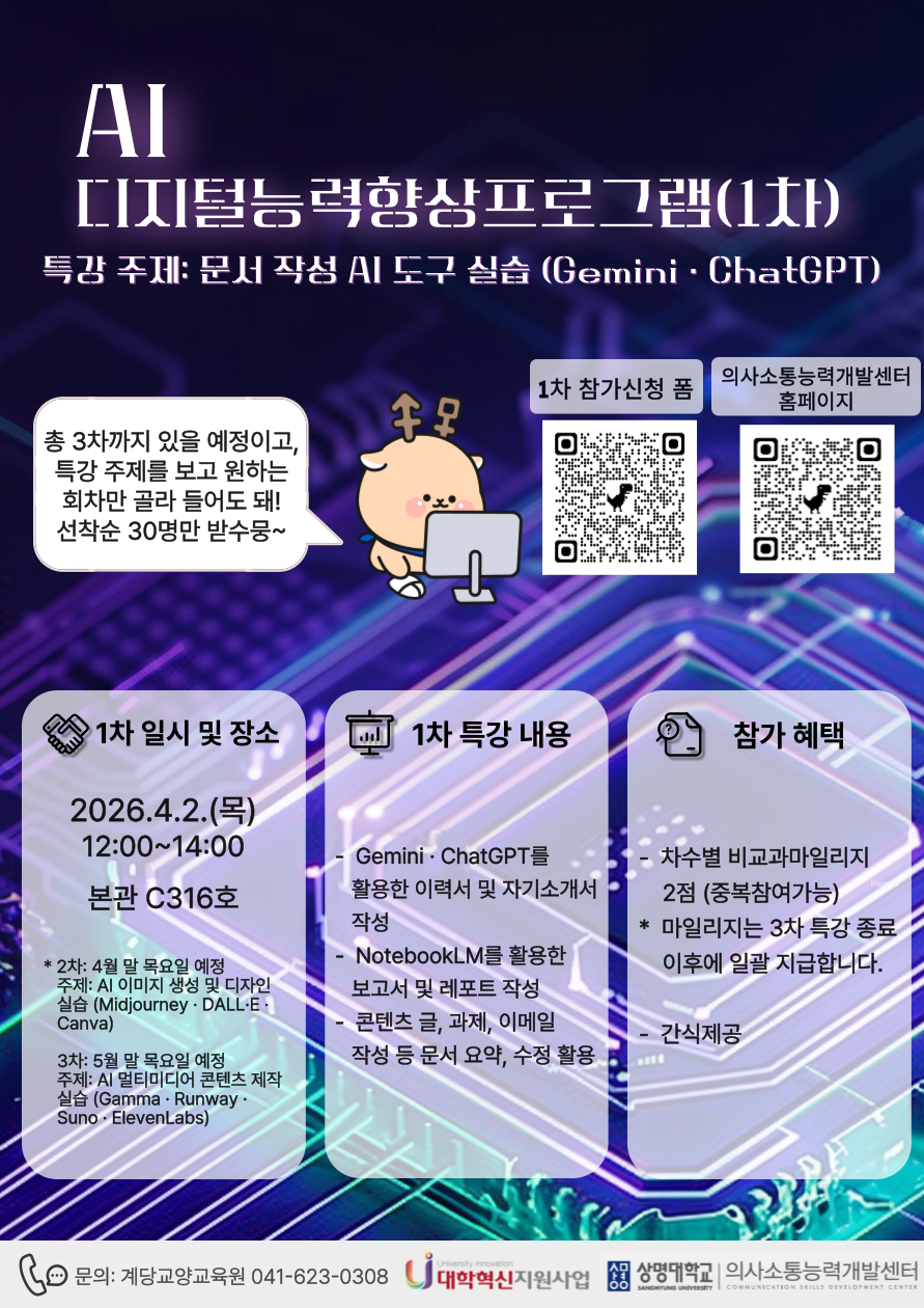 천안 [비교과] [의사소통능력개발센터(천안)] 2026-1 AI 디지털능력향상프로그램(1차) 참여자 모집 -