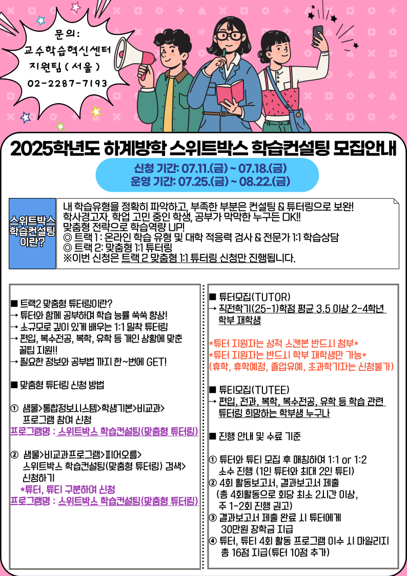 서울 [비교과] [교수학습혁신센터지원팀(서울)]2025학년도 하계방학 스위트박스 학습컨설팅_트랙2 맞춤형 1:1 튜터링 모집 안내 -